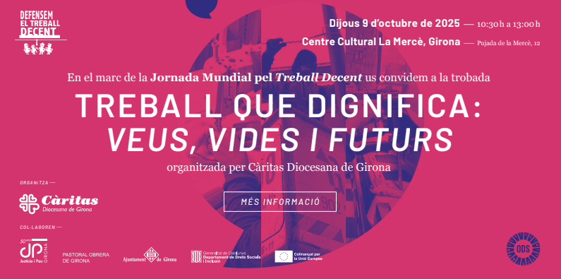 En aquest marc, el dijous 9 d’octubre tindrà lloc a Girona la jornada ‘Treball que dignifica: Veus, Vides i Futurs’. L’acte es durà a terme al Centre Cultural La Mercè, de 10.30 a 13 hores, i estarà obert a tota la ciutadania.